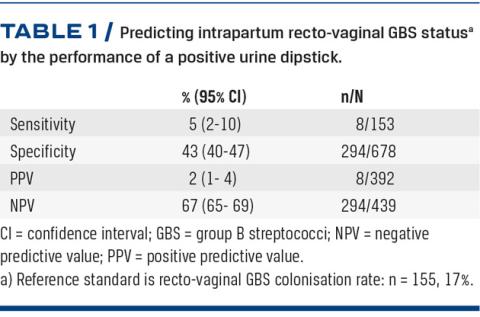 Conclusion: Dipstick urine analysis had a low sensitivity for predicting intrapartum recto-vaginal colonisation with GBS.