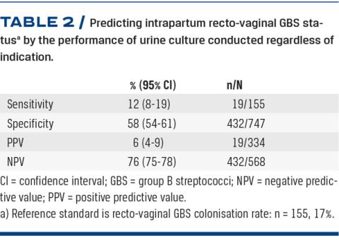 The aim of this study was to assess the performance of dipstick urine analysis anytime during pregnancy for prediction of recto-vaginal GBS colonisation at the time of labour.