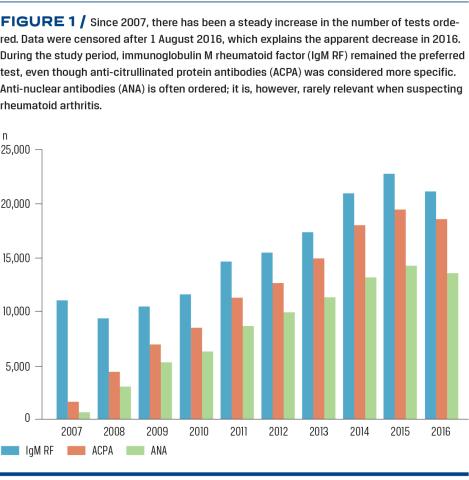 We have shown that IgM RF and ACPA are increasingly ordered and often repeated several times (Figure 1 and Figure 3). A great strength of this study is the large population, which consists of 60,300 individuals, of whom 5% had RA (Figure 2).
