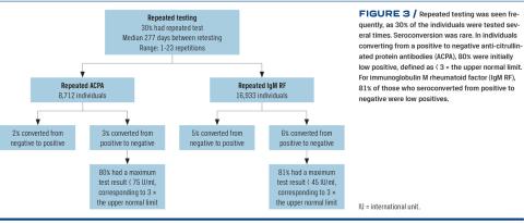 results have been found for ACPA in a Swedish cohort study [18]. The low percentage of seroconversions from negative to positive indicates that these biomarkers are present at the time of initial testing with few exceptions. Hence, the value of retesting is marginal, which should be kept in mind before repeating a test in primary care. The low percentage of seroconversions from positive to negative indicates that seropositive individuals remain positive. Among patients who seroconverted from positive to negative, 80% were low positives. Low levels of IgM RF and ACPA are less specific for RA than high concentrations [19]. Serology is only useful during the diagnostic workup; when a RA diagnosis has been reached, there is no reason to repeat the tests [1].