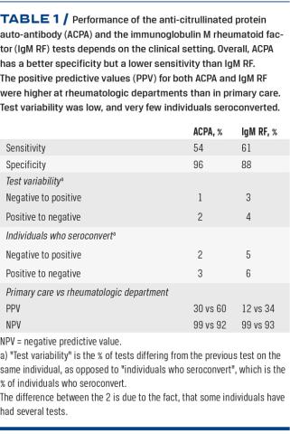 Results: Overall, 5% were diagnosed with RA. IgM RF remained the preferred test during the entire period. Test sensitivity was 61% for IgM RF and 54% for ACPA. The test specificity was 88% for IgM RF and 96% for ACPA. PPV was higher for ACPA than for IgM RF (30% versus 12%) and NPV was equal (99%) in primary care. Few individuals seroconverted from negative to positive (ACPA 2% and IgM RF 5%) and positive to negative (ACPA 3% and IgM RF 6%).