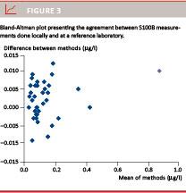 In the period from 4 July to 14 August, 2013 patients who were evaluated after minor head trauma at the Emergency Department at Koege Hospital had their blood sampled for measurement of S100B concentration in peripheral blood on a random spot basis. Blood was only sampled after the patients had provided informed consent. Blood samples were analysed at the Department of Clinical Biochemistry, Koege Hospital, using Cobas e411 apparatus (Roche Diagnostics). For validation, the samples were also analysed at the Department of Clinical Biochemistry at Rigshospitalet using Cobas 8000 apparatus (Roche Diagnostics). Agreement between test results was analysed using the Bland-Altman method [9].