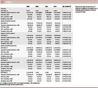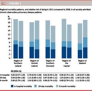 In 2011, the incidence rate (per 1,000 inhabitants) of acute hospitalizations for COPD was 1.26 for the Region of Northern Jutland, 0.86 for the Region of Central Jutland, 1.07 for the Region of Southern Denmark, and 1.06 and 1.15 for the Region of the Capital and the Region of Zealand, respectively (Table 2).