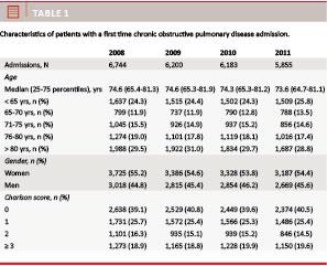 A total of 24,982 patients were admitted with a first-time COPD exacerbation from 2008 through 2011 (Table 1). Women comprised 55% of all patients in both 2008 and 2011. The median age at first admission was 74 years. The proportion of patients who were younger than 70 years of age increased by 3.1 percentage points (pp) during the study period. More than half the population had a Charlson score of ≥ 1; and the proportion of patients with a Charlson score of two decreased by 1.8 pp, while patients with a score of zero increased by 1.4 pp.
