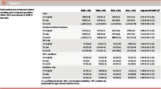 We calculated the proportion of patients receiving the different treatments and the proportion of patients dying from any cause in-hospital, within 30 days, and within six months of admission. All analyses were performed at a national level and followed by analyses of subgroups at the regional level. Comparisons over time were made by computing the relative risk (RR) with 95% confidence intervals (CI) of the treatment modalities and of death, respectively, in 2011 relative to 2008. RRs were adjusted for age, sex and Charlson score using the Mantel-Haenszel method to remove potential confounding effects of these. We assessed the trend in treatment and mortality across the study period using a Spearman rang correlation test, with the null hypothesis that the distribution remained the same during the study years. An alpha level of < 0.05 rejected this hypothesis, and the Spearman correlation coefficient (r) was used to assess the direction of the trend. Data were analyzed using SAS 9.3.