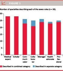We found that all seven roles were described in almost two-thirds of the professional profiles. However, the detail of description varied greatly and only nine specialties described how each of the seven roles were ranked by importance. For specialties which did have a description of ranking, the medical expert and the scholar roles were ranked as the most important. Seven specialties used score sheets, of which only six were publicly available.