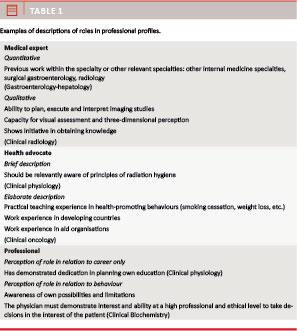Results: Twenty-four (63%) of the 38 profiles described the contents for all of the seven roles and four (11%) described the contents only for some of the roles. Nine specialties (24%) described a clear ranking of the seven roles with the medical expert and scholar roles generally ranked as most important. Seven specialties (18%) used standardised score sheets as part of the application process. Four (11%) specialties had updated their professional profiles.