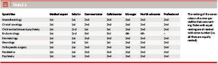 Use of score sheets may be an indirect way of ranking the roles by importance. Thus, in some cases, different maximum scores were used for each role (e.g. in otorhino-laryngology; scholar up to seven points and health advocate up to one point). However, for other specialties (anaesthesiology, orthopaedic surgery and neurology), all roles had a similar weighting of the roles according to their score sheets, while they were ranked differently according to their professional profile.