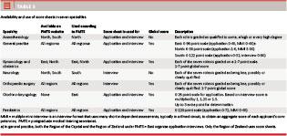 Seven of 38 specialties (18%) used score sheets, though their use varied among the different PMTSs (Table 3). Two specialties used score sheets only for the interview assessment, and five specialties used score sheets for both assessment of the written applications and for interviews. Five specialties used seven different global score systems which varied in terms of possible maximum scores from seven to 122 depending on the specialty. One specialty (general practice) used a different system in each region.