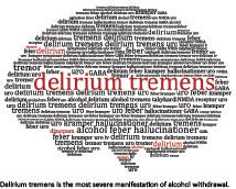 Acute alcohol ingestion causes central nervous system depression through excitation of inhibitory γ-aminobutyric acid-A (GABAA) receptors, inhibition of the N-methyl-D-aspartate (NMDA) component of excitatory glutamate receptors as well as interaction with serotonin and dopamine receptors. Excitation of the GABAA receptor leads to anxiolysis, sedation and impaired motor coordination. Chronic alcohol ingestion induces tolerance through reduction of GABAA receptor function as well as up-regulation of NMDA receptors, which results in a compensatory increase in excitatory neurotransmission. Lack of inhibition by alcohol due to reduced or discontinued alcohol use leads to excessive central nervous system excitation (symptoms of withdrawal) [2]. Withdrawal symptoms arise within hours to days of alcohol abstinence and range in degree from sympathetic hyperactivity, nausea or vomiting to hallucinations and withdrawal seizures and, most severely, delirium tremens (DT). Clinically, DT presents as disorientation, agitation, hallucinations, tremors, diaphoresis, tachycardia, hypertension and pyrexia (i.e. symptoms corresponding to hyperactive delirium). DT occurs in 5-20% of alcohol withdrawals, typically 1-5 days after alcohol abstinence, and DT carries a mortality rate of up to 25% although treatment can reduce this to 0-1% [3]. Mortality is caused by complications to the clinical manifestations of DT, i.e. myocardial infarction due to autonomic hyperactivity [2]. Delirium usually lasts from three to five days, up to two weeks, though rare cases of even longer DT periods do exist [4].