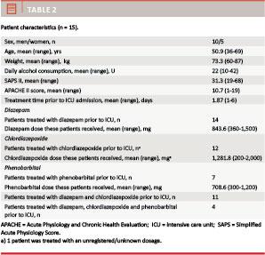 Five women and ten men were included. Their mean age was 50.9 years (36-69 years). See Table 2 for patient characteristics. All patients had prior contacts to the health-care system for alcohol withdrawal; one patient had been diagnosed with DT during an earlier admission. Apart from one patient who was registered as having an abuse of benzodiazepines (30 mg diazepam daily), no other medicine or substance abuse was registered. The average reported alcohol consumption was 22 U (1 U = 12 g, or 1.5 cl of 100% alcohol) daily. Treatment for alcohol withdrawal and DT was started in the medical or psychiatric ward, a total of 14 patients were treated with diazepam, seven received phenobarbital, while 12 received chlordiazepoxide. Medication was given over approximately two days without adequate effect (sleep) before admittance to the ICU.