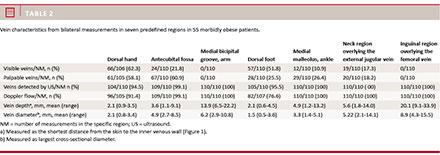 Conclusion: With the aid of ultrasound it is possible to identify a minimum of one peripheral vein suitable for IV access in morbidly obese patients.
