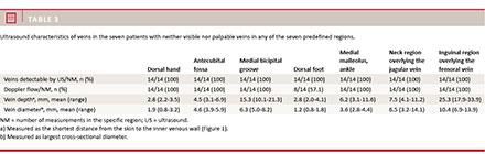 Results: In our study group, all patients had a minimum of one peripheral vein that was suitable for peripheral venous access, including seven patients (12.7%) who did not have clinically detectable veins.