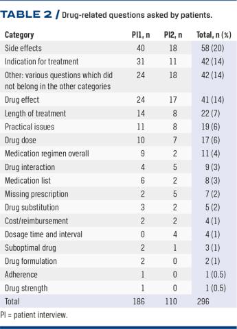 A total of 126 patients (80%) asked 296 (range: 1-10) drug-related questions. The majority of the questions were made during PI1 (Table 2).