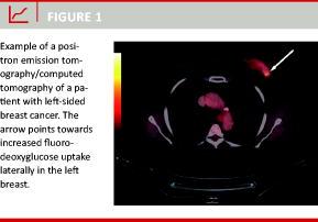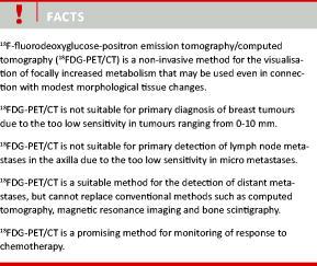 Breast cancer (BC) is the most frequent malignant disease among women in Denmark with more than 4,100 new cases and nearly 1,300 deaths annually [1, 2]. The prognosis depends on a number of tumour characteristics, e.g. tumour size, spread to regional lymph nodes and distant metastases. Early diagnosis improves survival [3]. Positron emission tomography (PET) is a visualisation technique based on increased uptake of the radioactively marked glucose analogue 18F-fluorodeoxyglucose (18FDG) in cells with augmented glucose metabolism (Figure 1). Used in combination with computed tomography (CT), the technique facilitates a more precise localization of areas with an increased fluorodeoxyglucose (FDG) uptake [4]. This systematic review gives an overview of the utility of 18FDG-PET/CT for primary diagnosis, staging and response to chemotherapy in BC.