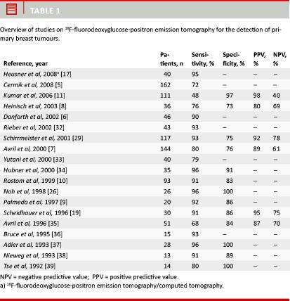 Table 1 shows a total of 19 studies on 18FDG-PET for the detection of primary breast tumours compared with histopathologic examination of tumour tissue after biopsy or surgery. Sensitivity ranged from 48% to 96% and specificity from 73% to 100%. Cermic et al [5] examined 162 patients with biopsy-verified BC and showed that sensitivity increased with tumour size. In Danforth et al‘s material [6], sensitivity increased with grade of malignancy from 83% for grades I and II to 96% for grades III and IV.