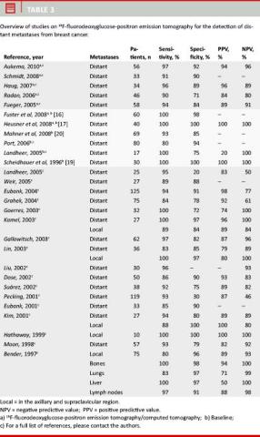 Generally, the studies showed that a positive PET scan predicted metastatic activity, while a negative scan with considerable probability indicated absence of disease. PET may thus be considered a sensitive diagnostic test which may play an important part in the detection of metastases either at baseline or in recurrent BC.
