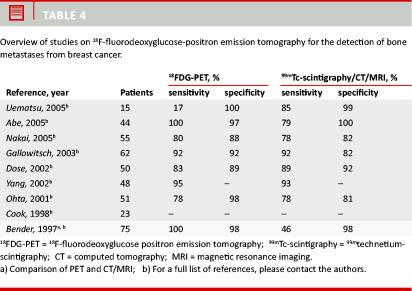 Table 4 shows eight studies comparing FDG-PET with 99mTechnetium bone scintigraphy for the detection of bone metastases and one study which compared PET with CT/MRI. PET sensitivity ranged from 17% to 100% (46-93% using conventional methods) and PET specificity from 88% to 100% (81-100% using conventional methods). It has been reported that PET was superior for the detection of osteolytic metastases with a visualisation rate of 100% versus 70% for scintigraphy. However, scintigraphy outperformed PET in osteosclerotic lesions with a 100% visualization rate versus 56% for PET.