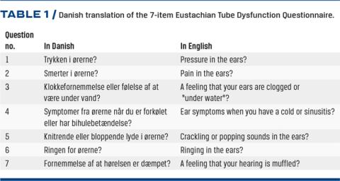 Conclusions: The ETDQ-7 has previously been validated in English, German, Dutch and Portuguese, demonstrating good clinical relevance. The Danish translation of the ETDQ-7 has produced similar results and may be valuable in diagnosing obstructive ETD and in monitoring the effect of balloon dilation of the Eustachian tube.