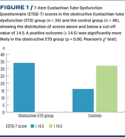 Methods: All participants underwent tympanometry, otomicroscopy and completed the ETDQ-7. We included 34 ears from patients with obstructive ETD who had abnormal tympanometry curves but no history of cholesteatoma or adhesive otitis. As a control group, 48 otherwise healthy ears with a normal tympanometry curve were included from patients with known sensorineural hearing loss or normal hearing.