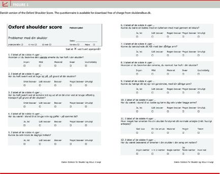 The prevalence of shoulder pain is increasing, and shoulder pain is the third most frequent disorder of the locomotor system after back pain and neck problems [1]. Several questionnaires have been developed to assess shoulder function [2] but the performance of these scoring systems has not been validated within a Danish setting. Results have traditionally been assessed using observer-administered measures. Scoring systems such as Constant Score (CS) tend to be inaccurate and affected by surgeons bias [3]. The existence of discrepancies between patients’ and surgeons’ perception of outcome is now generally accepted [2]. This difference in perception of outcomes has stimulated research into and development of patient-administered scoring systems. The Oxford Shoulder Score (OSS) was introduced in 1996 [4] and is designed to measure outcomes following treatment of shoulder conditions. The questionnaire contains 12 items to be completed solely by the patient. Each item has five response categories. The questionnaire includes a mix of pain-related questions and questions about functional ability. Scores range from 12 (best; no pain or functional limitation) to 60 (worst). When using this instrument it is necessary to take into account that lifestyle and cross-cultural differences may affect scores in different countries. We have translated the OSS into Danish language according to the criteria’s presented by Guillemin et al [5]. The objective of the study was to validate the Danish translation and retest the psychometric properties of the OSS in a Danish setting.