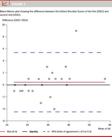 Material and methods: A total of 102 consecutive patients referred to our shoulder unit were recruited for the study. The OSS was translated into Danish according to recommendations presented by Guillemin and co-workers. We established the psychometric properties of the scoring system. Test-retest reliability was assessed by inviting 32 patients to complete another OSS 72 hours after the first test. The Bland-Altman plot was used to show absolute differences between test and retest.