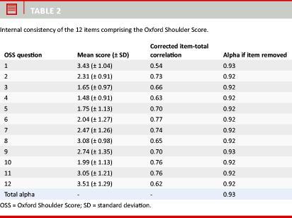 The Spearman rank correlation coefficient between the OSS and the CS was 0.74. The test for internal consistency resulted in a total Cronbach’s alpha of R = 0.93. Elimination of each of the 12 items did not result in values below 0.916. Except for item 1 (pain), all items showed a correlation exceeding 0.62 ( (Table 2)Table 2).