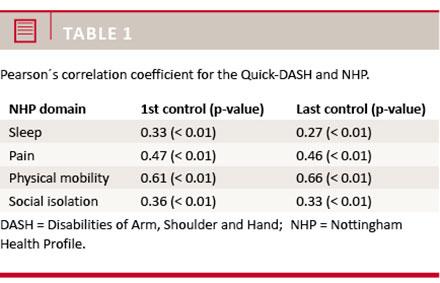 At our Hospital’s Orthopaedic Department, we included 61 consecutive patients who were treated for fractures of the distal radius. Patients were excluded if they were under 18 years of age, were mentally unfit to participate, if they were unable to read or write Danish, had known disorders to the upper extremities or other disabling medical conditions or if they declined to participate. Patients either received conservative (five weeks with a dorsal cast) or operative treatment prior to their first ambulatory follow-up at one week. They all answered the QuickDASH and the NHP at this visit and then again at their last ambulatory follow-up visit at six weeks. Furthermore, at the last follow-up, a QuickDASH-questionnaire was handed out along with a postage-paid return envelope that patients were instructed to complete at home one day after their last follow-up in order to facilitate calculation of test-retest reliability. If any items were missing, patients were contacted either in the ambulatory facility or by phone, and the items were completed.