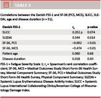 It was hypothesized that the translated FSS would display correlation with both SF-36 subscales, but not with the SLEDAI, the SLICC, age or disease duration.