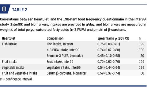 In the present study, we found that the intake of fruit, vegetables, fish, wholegrain and SFA in HeartDiet overall was in good agreement with the 198-item FFQ used in the Inter99 study. Also, the comparison between serum β-carotene and serum n-3 PUFA showed a good correlation between HeartDiet and the dietary intake of fruit and vegetables, and fish, respectively.