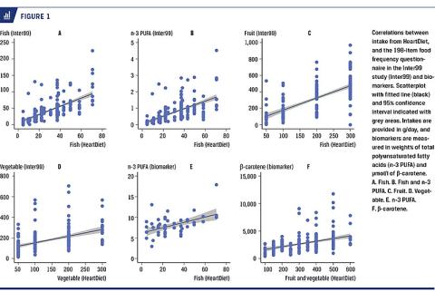 I Data from HeartDiet on fish, fruit and vegetables were compared with corresponding results from the 198-item FFQ. Additionally, intakes of fish and fruit/vegetable were compared with their respective biomarker. All analyses were conducted using scatter plots and the Spearman’s rank correlation coefficient with 95% confidence interval (CI) calculation using Fisher’s z-transformation.