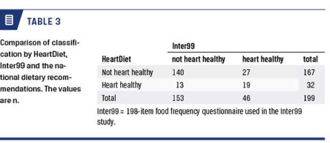 HeartDiet is well aligned with the 198-item FFQ used in the Inter99 study, and our choice of 75% as a limit between a heart-healthy and a not heart-healthy diet is sensible and useful in clinical practice. In addition, HeartDiet is a practical and easy and quick-to-use tool, and HeartDiet will hopefully prove helpful in the clinic and place a focus on diet and improvement of diets with the purpose of prevention of vascular disease.