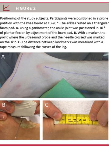 Identification of the proximal landmark: The proximal landmark was defined as the distal tip of the soleus muscle. On US, this was defined as the point where the most distal muscular fibres inserted into the Achilles tendon (Figure 3). The landmark was identified, projected to the skin and marked in the same way as for the distal landmark.
