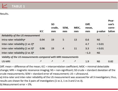 Both the inter-rater and intra-rater reliability were fully comparable with measurements using extended field of view (EFOV) US imaging [13]. The advantage of EFOV measurement is its ease and the possibility of saving the pictures for later analysis and/or control. On the other hand, the advantage of the present US measurement is its relative ease and that it is a low-cost technology, making it applicable in any US setting.