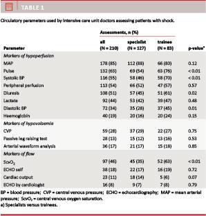 MAP was the most frequently used circulatory parameter and fluid the most frequently given treatment by ICU doctors assessing patients with shock. The results indicate that assessment of hypoperfusion leads to the use of a marker of hypovolaemia, but in some cases fluid was given without this assessment. Moreover, only half of the patients had assessments of both hypoperfusion, flow and hypovolaemia. The haemodynamic assessment differed between ICU specialists and trainees.