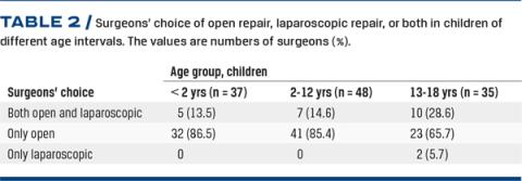 One out of seven surgeons considered laparoscopic repair for children < 2 and 2-12 years of age, while one in three considered laparoscopic repair for children 13-18 years of age. Among the surgeons who considered laparoscopic repair for children > 2 years of age, most performed both acute and elective laparoscopic procedures. For children < 2 years of age, three out of five surgeons considered laparoscopic repair for elective procedures only. More surgeons considered laparoscopic repair for recurrent hernias than for primary hernias, but whether the hernia was unilateral or bilateral did not influence the choice of laparoscopic repair.