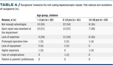 The reasons for not using laparoscopy for inguinal hernias in children are presented in Table 4. The top three reasons were, in order: not enough advantages, open repair was standard at the department, and lack of expertise. Furthermore, for children aged 2-12 years and 13-18 years, four (10%) and five (22%) surgeons, respectively, commented that they avoided laparoscopic repair because they did not want to insert a mesh.