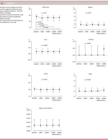In our research department, we use the VRS as a standard tool to produce transcriptions of scientific articles of a high initial accuracy. However, this may require a considerable amount of training with the VRS. In our experience, this VRS program for transcription of dictated scientific articles may become completely error-free through additional training of the program. This was not tested in the present study and may be the subject for a future study. A study evaluating 1 month’s use and training of VRS in a clinical department found that this was insufficient to achieve complete accuracy [5]. However, this was for clinical use and not for dictation of scientific articles, and it was unclear how the training was performed in the study. For dictation of scientific articles, VRS may be a feasible option since a secretary service is not available in many research departments. Moreover, this study evaluated the use of VRS in non-native English researchers dictating in English language. Thus, the transcript may have been more accurate if the authors had been native English speakers. Lastly, using non-validated scales, a statistically significant difference as found in the present study may not necessarily translate into a practically important difference. However, statistical testing was used as a tool to quantify the effect of the number of added words.