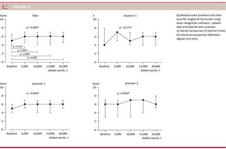 Three experienced researchers performed a subjective qualitative assessment of the transcripts. This was done using a readability score (Likert scale 0-10) for measuring the degree of ability to understand the meaning of the text. The following three intervals considering the degree of meaning were created: 0-3: limited (difficult to grasp), 4-6: moderate (the essential part of the text understood with some uncertain details), 7-10: high (easy to understand without any disturbing errors). The assessors were blinded for author, title and number of added words to the VRS vocabulary; and the assessment order of transcripts was randomized. Thus, the assessor did not know the number of added words.