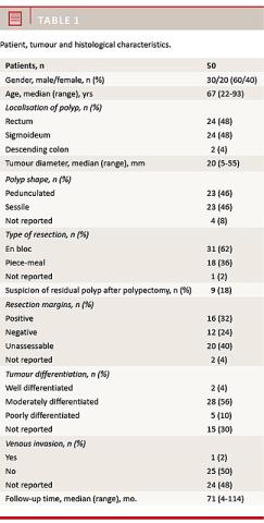 Two patients had local recurrence: An 81-year-old woman with a sessile polyp, positive resection margins and a rectal MRI showing invasion into the rectal wall declined surgical treatment and received chemotherapy. Local recurrence was discovered two years later and the patient died one year later from her cancer. The second patient was a 69-year-old male with unassessable resection margins after a piece-meal removal (pedunculated polyp). The patient declined to undergo follow-up. Recurrence occurred after five years and the patient