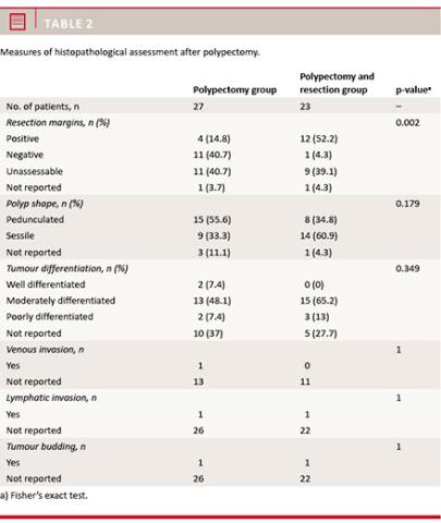We observed no significant difference in local recurrence or distant metastasis between the two groups in our study. However, overall survival was low in patients treated with polypectomy alone, which was also observed by Cooper et al [19]. In our study, however, we observed no difference in cancer-free survival. The lower overall survival rate could be explained by selection bias, resulting in a non-surgical treatment in the elderly or generally ill patients. Selection bias may also explain why not all patients with sessile polyps and unassessable/positive resection margins progressed to further surgery. It is therefore crucial to develop better methods for staging and evaluating the margins in these patients. Among the important limitations of the present study are the low number of patients, the absence of data on certain pathological factors along with the retrospective observational nature of the study. Cancer-free survival did not differ between the two groups. However, a higher rate of lymphovascular invasion and tumour differentiation grade in the histological reports would possibly have resulted in a different treatment option; and a larger number of included patients would have produced a more accurate estimate of survival. Centralised pathological evaluation of polyps, multidisciplinary team (MDT) conference discussions and second revision of polyps with unclear margins may lead to more precise evaluations. Future large-scale comparative studies with multivariate analysis should analyse in detail risk factors for outcome after different approaches to the treatment of malignant colorectal