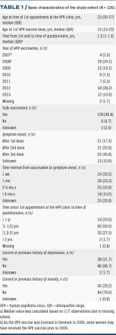 The fact that a large proportion of the included women remained heavily affected by symptoms and reported no symptom improvement is concerning, especially because the majority reported that the symptoms had a negative impact on their daily life and reduced their ability to work or attend school. Some of the most common physical symptoms reported in the present study were general and unspecific symptoms such as headache, fatigue and dizziness. These findings are in line with results reported in previous studies [14, 16, 17]. However, although the proportion of women with anxiety and/or depression was high (approx. 30%) in the present study, the women reported that physical symptoms affected their daily life more than psychological symptoms did. As we have no information on depression and anxiety prior to HPV vaccination, we are unable to assess whether the evolution of symptoms was associated with a psychological disorder. Previous studies have reported that women suffering from presumed side effects are more likely to have a preexisting psychological disorder and increased care seeking in the two years before the first HPV vaccine dose compared with women who report no side effects [18-20]. In the present study, we have no information on depression and anxiety prior to HPV vaccination. However, the high proportion of a current or previous history of anxiety and/or depression may suggest a vulnerable patient group in need of a specialised treatment plan.