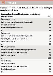 Results: The participants had experienced 742 adverse events during the previous month. The most frequent event types were lack of documents, referrals not performed, blood tests not available and lack of documentation. Problems related to reporting and learning and insufficient follow-up and feedback after serious events were the most frequent complaints. A poor patient safety climate and increased cognitive demands were significantly correlated to adverse events.