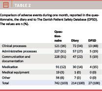 Table 2 compares the 742 AEs reported in the questionnaire to the 27 AEs that were reported to the obligatory national database during the same month and the 214 AEs identified in the same month using a diary method [12]. The difference in numbers obviously reflects the different methods of data collection.