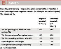 As shown in Table 3, the doctors and nurses do experience managerial encouragement to report events at the local department management level especially at the regional hospital, but actual changes demand support and contribution from the hospital management. Data from the Capital Region were collected five years before this study, and the issue of patient safety has been highly debated since then, which might affect reporting behaviour, and this should be born in mind when interpreting the findings summarised in Table 3.