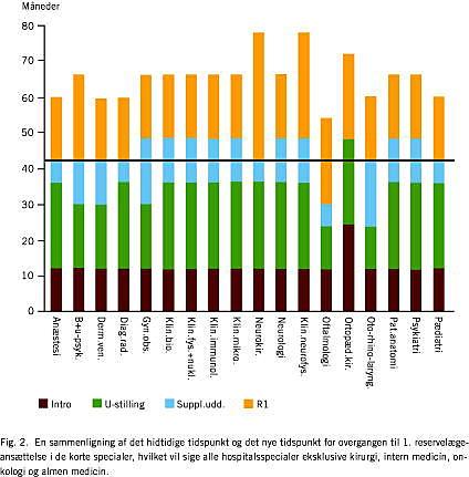 I Fig. 2 er specialerne arbejdsmedicin, samfundsmedicin, klinisk farmakologi og klinisk genetik ikke med, fordi det i den gamle speciallægeuddannelse ikke var fastlagt, om uddannelsen skulle foregå som reservelæge eller 1. reservelæge. Men der er tale om en markant forbedring i forhold til tidligere.