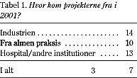 Som det fremgår af Tabel 1 kommer projekterne nogenlunde lige hyppigt fra medicinalindustrien, almen praksis, hospitalsafdelinger eller andre offentlige institutioner. Af de 10 projekter fra almen praksis kom de 7 fra institutter og forskningsenheder, mens 3 kom fra praktiserende læger uden eller med kun mere perifer tilknytning til de almenmedicinske universitetsmiljøer. Der er fortsat en stor interesse i at benytte almen praksis til at rekruttere patienter til hospitalsbaserede undersøgelser.