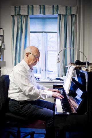 Arbejdet, det »elsker« han, og han har da også indrettet sig hjemligt i praksis med bogreoler, klaver og sofa. Bøgerne er der ikke plads til derhjemme mere, så de står nu i venteværelset, så patienterne kan læse i dem. Sofaen lægger han sig på, når han trænger til det – og klaveret? Det vender vi tilbage til.