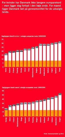 I forhold til de nordiske lande er der for danskernes vedkommende langt igen til f.eks. svenskernes niveau, hvor kun 18 procent af befolkningen ryger. I Finland er der heller ikke mange rygere i forhold til Danmark, 23 procent.