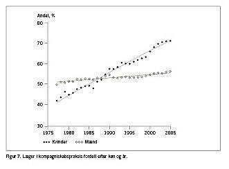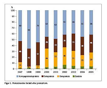 Kvindelige praktiserende læger er mest tilbøjelige til at arbejde i kompagniskabspraksis. I Figur 7 er vist, at ca. 70% af kvinderne arbejder i en kompagniskabspraksis mod 55% af de mandlige praktiserende læger. Antallet af kompagniskabspraksis er generelt svagt stigende og udgør nu ca. 800 mod 1.400 solopraksis. Det kan have betydning for rekrutteringen fremover, at praksis er kompagniskabspraksis eller samarbejdspraksis. I løbet af de sidste 25 år er andelen af kompagniskabspraksis imidlertid kun steget fra ca. 28% til nu 36%.